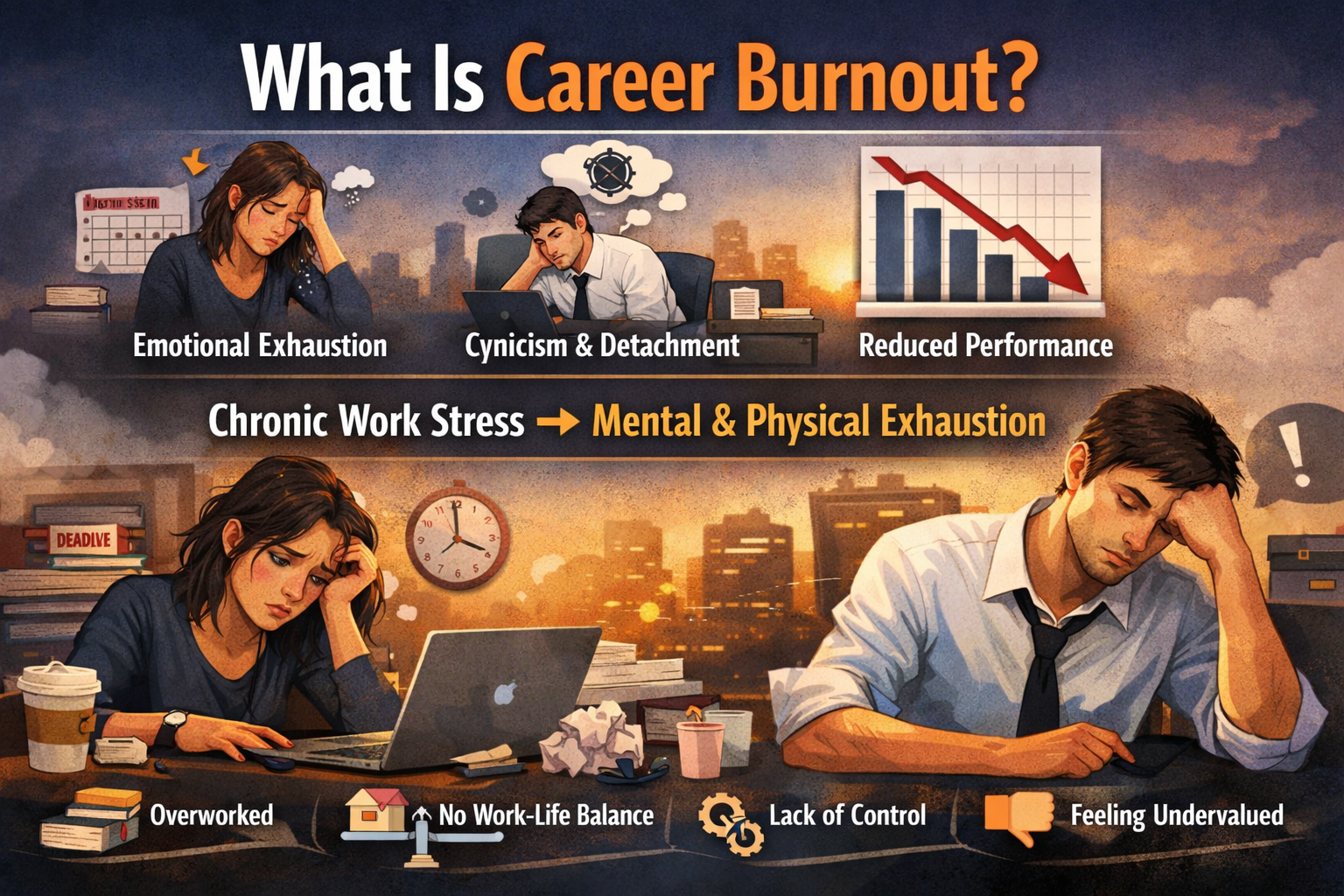 Career burnout is a state in which a person continuously experiences workplace stress. Slowly, it leads to physical, emotional, and mental exhaustion. Burnout does not simply mean feeling tired. It is a deeper condition that affects overall well-being. Because of burnout, our productivity decreases, our motivation goes down, and even simple tasks start to feel difficult.