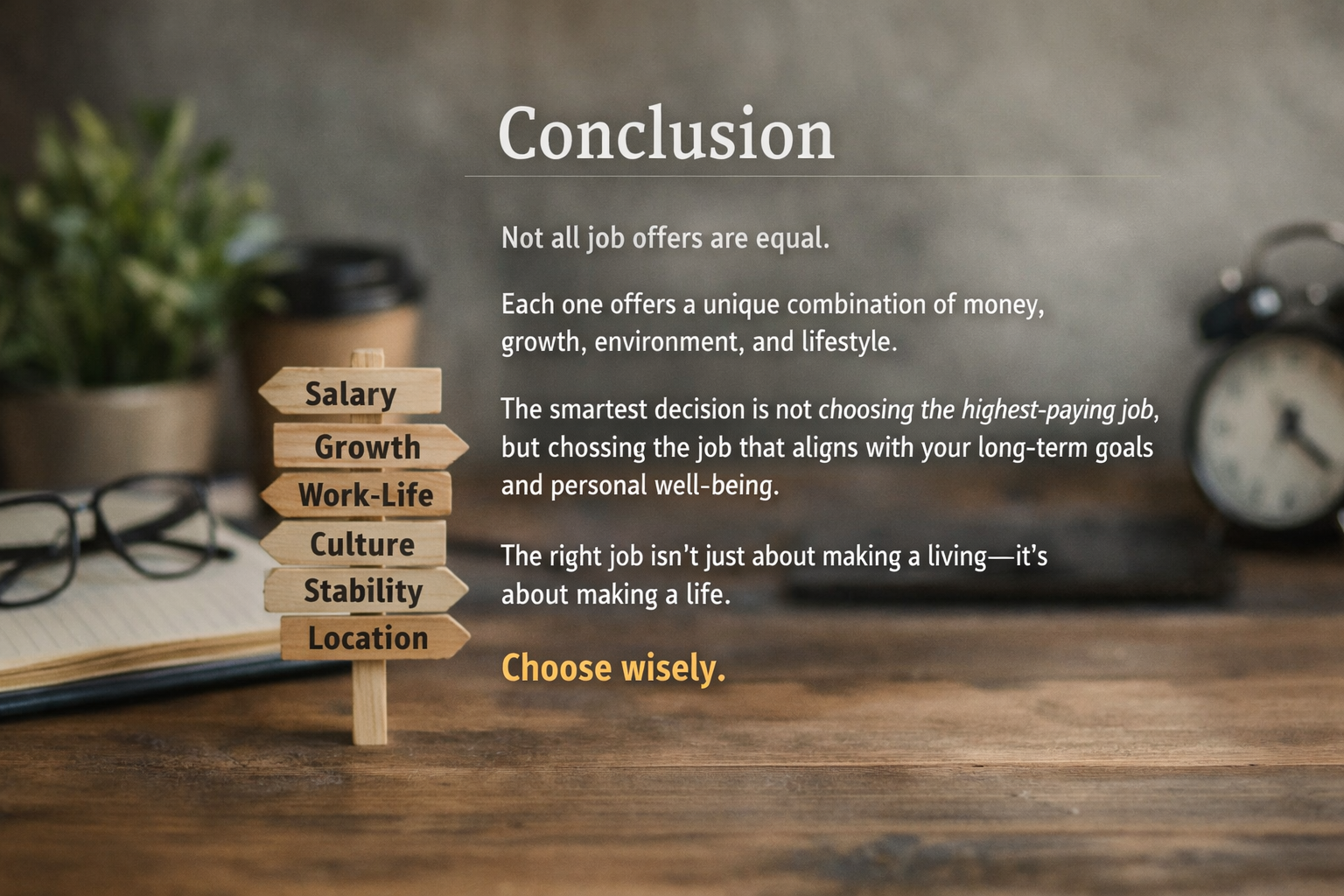 Choosing the right job means looking beyond the paycheck and evaluating how it impacts your career, learning, lifestyle, and long-term happiness. The best offer is not always the highest-paying one—it’s the one that supports your growth, well-being, and future aspirations.
