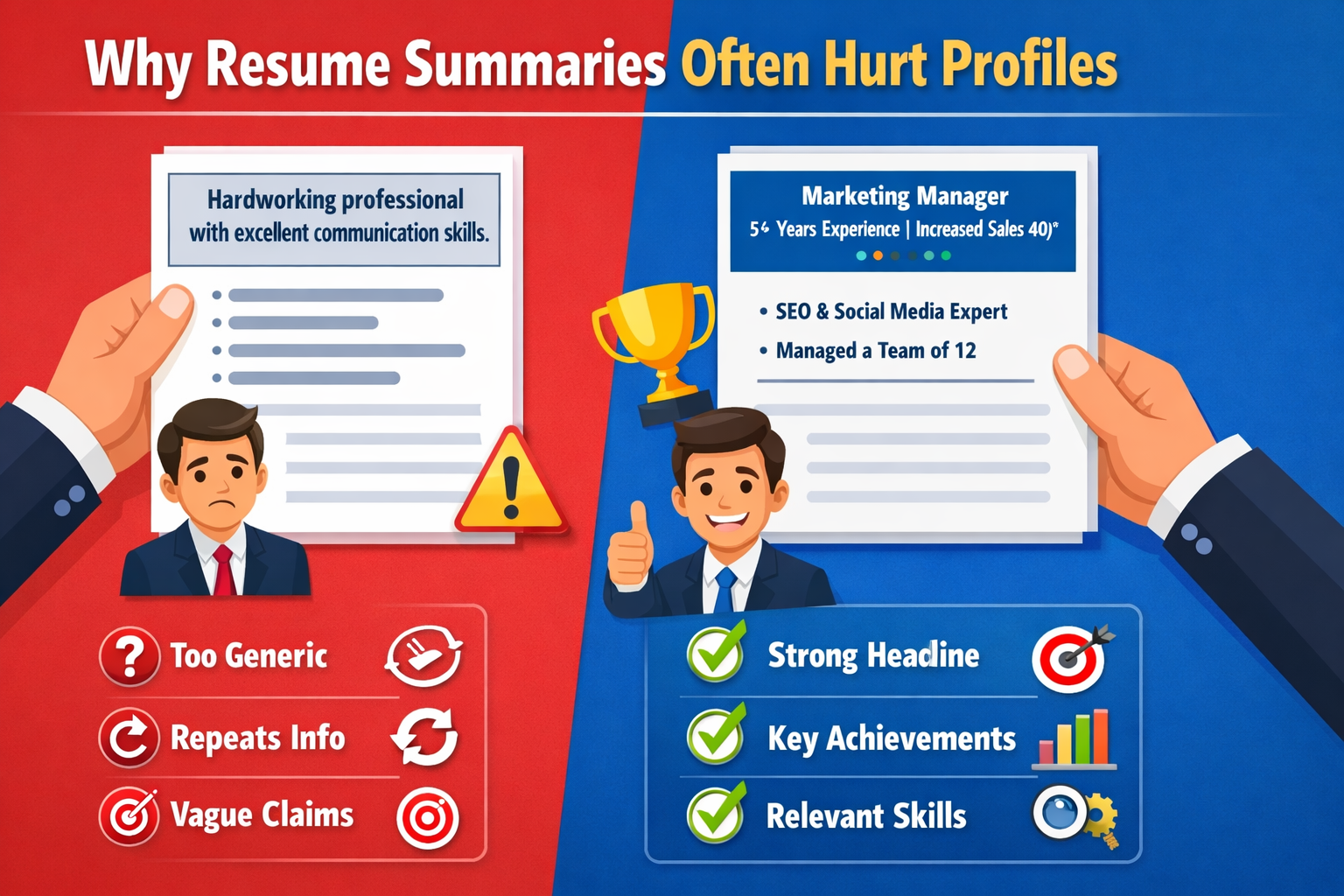 This creates a mismatch. When the summary sounds bigger than the experience, recruiters may feel the candidate is exaggerating.