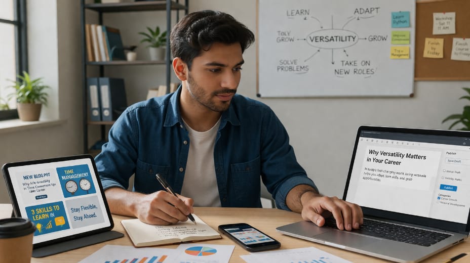 Versatility means the ability to adapt, handle different situations, and perform a variety of tasks or roles effectively. In simple words, it means staying flexible and adjusting easily, no matter what the situation is. When a person is versatile, it becomes easier for them to grow, and both their life and work improve.